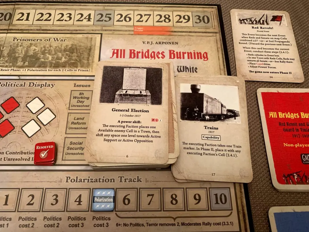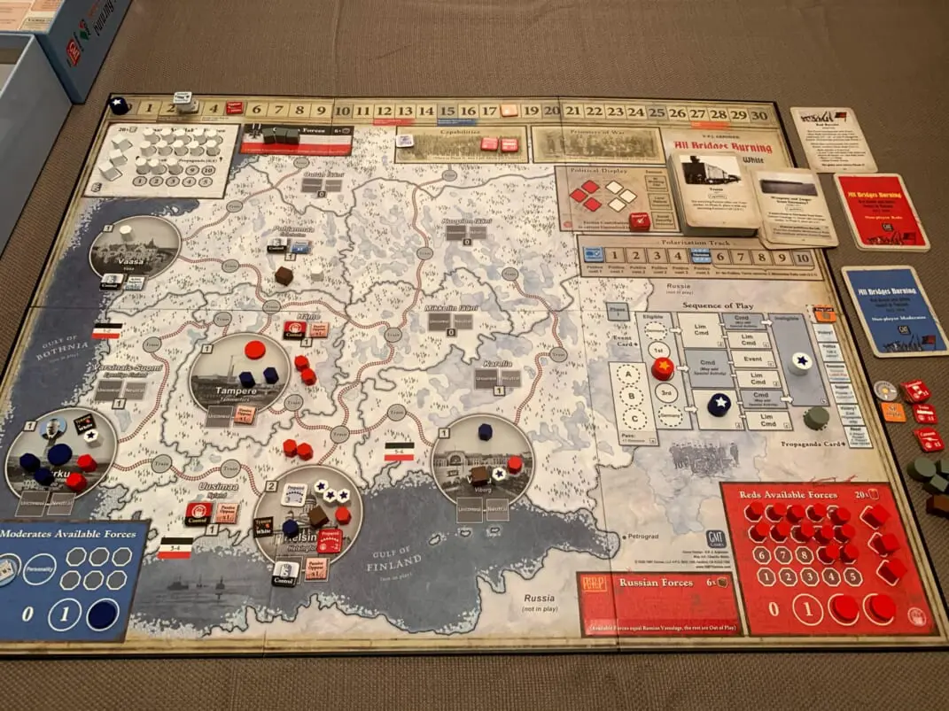 All Bridges Burning recreates the political and military affairs of the Finnish civil war in a new COIN System volume for three players. The Reds seek to stage a working class revolt and then hold onto their gains, while the White Senate forces seek to reassert control. A third, non-violent Social Democratic faction fights for the survival of moderate leftism and political reform. All three factions must keep the national sentiment conciliatory enough for a post-conflict settlement and national independence. In addition, the non-player powers of Germany and Russia offer military assistance to the Senate and the Reds, respectively. Excessive foreign involvement, however, could quash the dream of Finnish independence and prompt a collective loss of all three player factions. Historical events, asymmetrical action menus, as well as extensive historical design notes familiarize the players with the historical period.