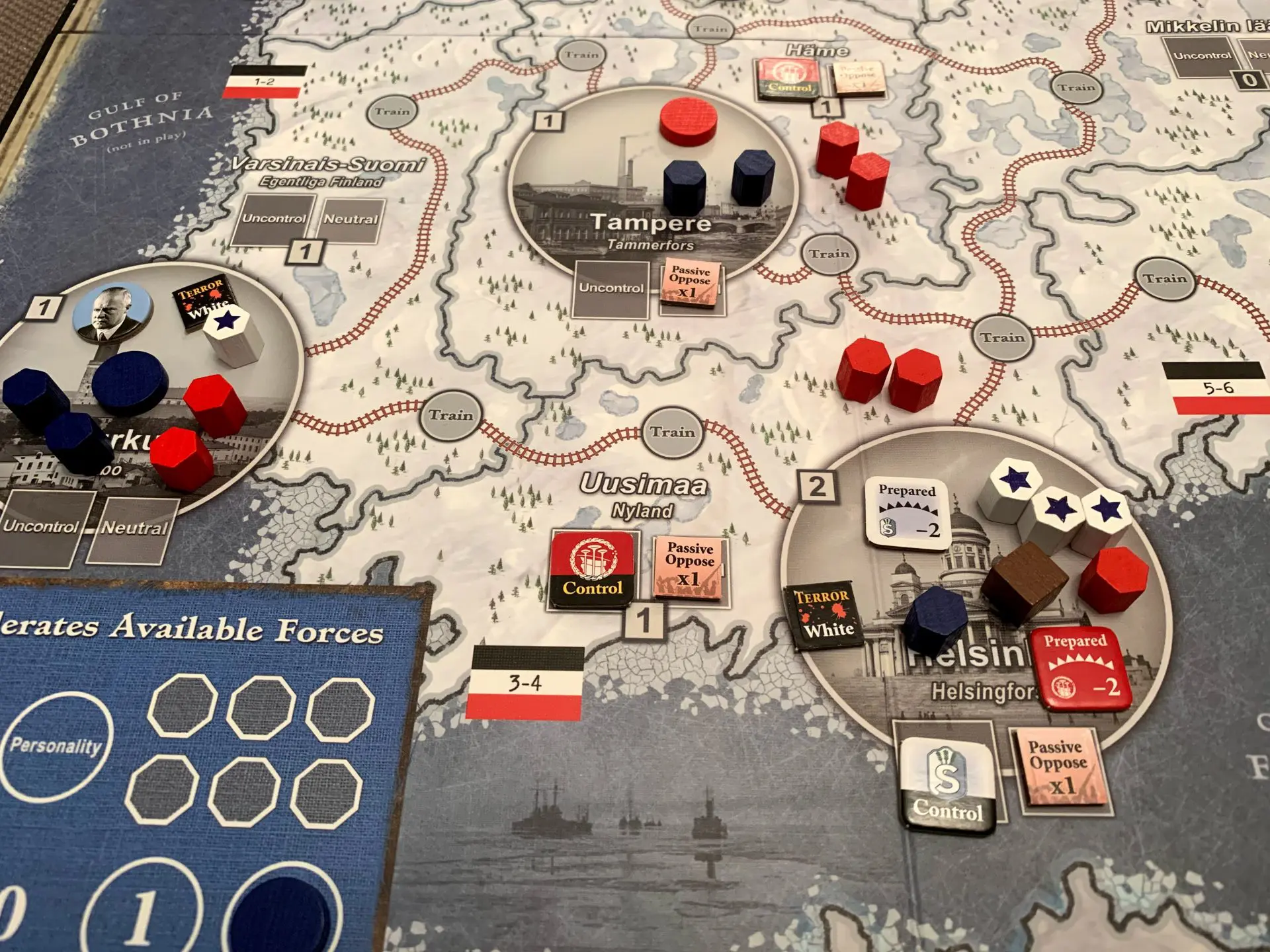 A unique sequence of play for three factions poses players –whether veteran or new to the COIN Series– fresh challenges in selecting from the asymmetric commands and special activities. The Reds will find themselves needing to split time and resources between competing tasks of solidifying the Red revolt by creating working organs of civilian administration on the one hand, and fighting an increasingly desperate war against a far more powerful enemy on the other. The White Senate faction, in contrast, has a more traditional war to fight. The Senate will want to enhance their military performance by capabilities such as armored trains, cannons, as well as the Finnish, German-trained 27th Jaeger Battalion. Meanwhile the Social Democrats will be focused on building and maintaining underground networks of information, distributing news across the fronts, and advancing a stagnating political process while fending off retributions from the two warring factions.