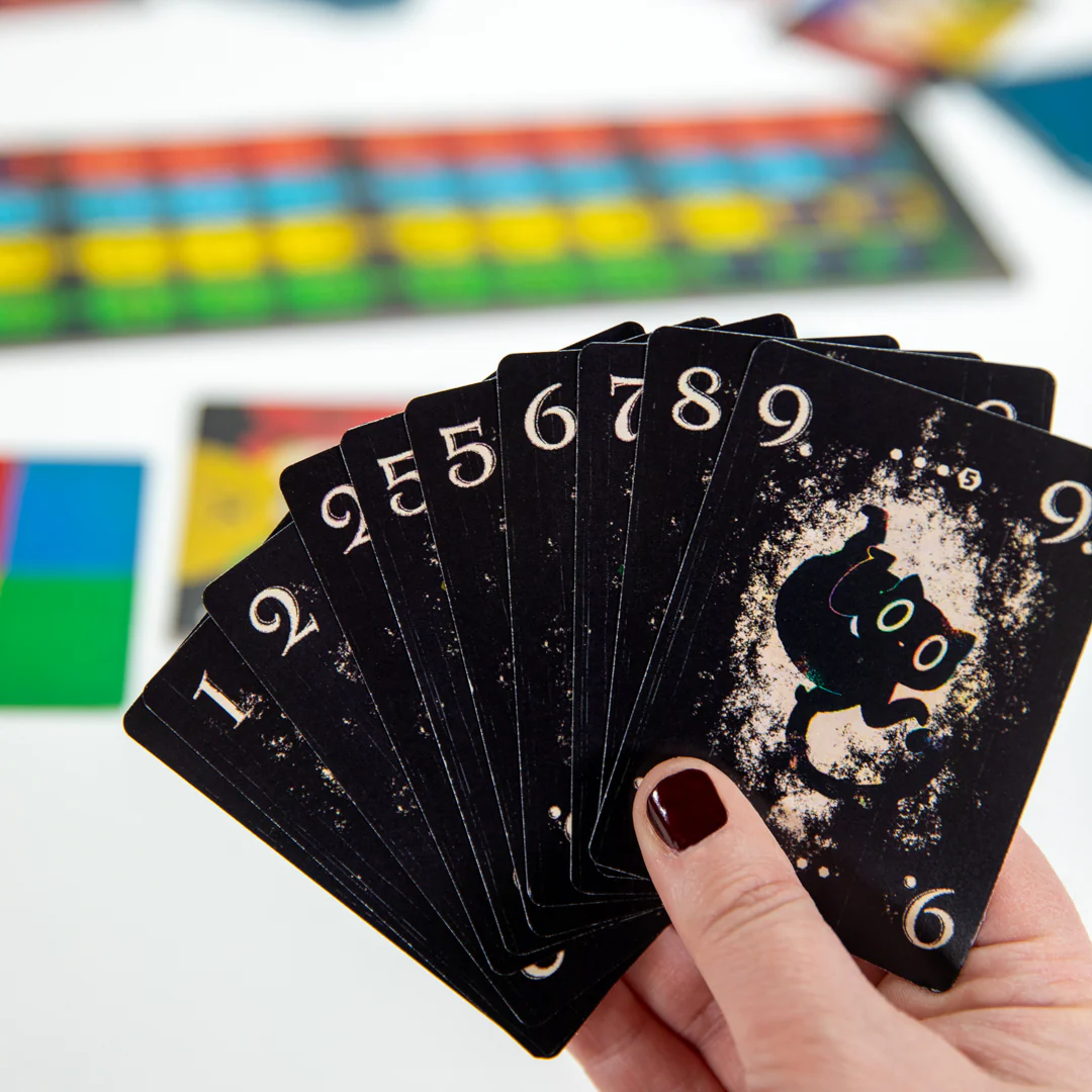 Cat in the Box: Deluxe Edition is the quintessential quantum trick-taking card game for 2 – 5 cool cats, where your card’s color isn’t defined until you play it! Hypothesize how many tricks you will win, and record your bid. Place tokens on the community research board as you play your hand, and connect large groups of tokens to score even more points. Plan your tricks carefully as you cannot claim the color of a card with the same number that has already been declared. Doing so would be pawsitively catastrophic as you have just created a paradox!