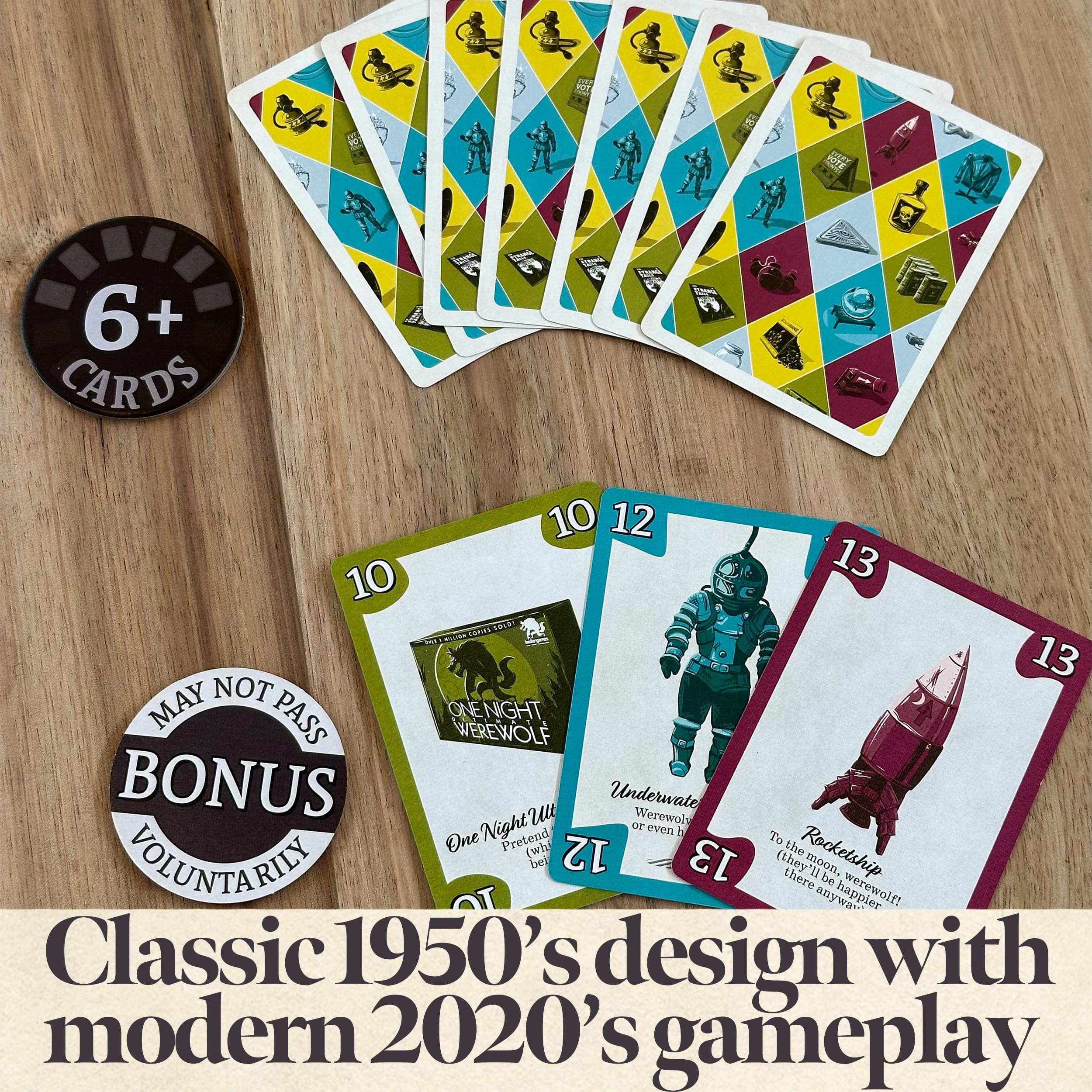 Seers Catalog is an almost-shedding card game in which each player tries to get rid of almost all of the cards in their hand. Each round, players have a unique set of artifacts that give them asymmetric abilities to help manage their hand of cards. When one player runs out of cards, the round is scored: Each card is worth -1, but if you have five or fewer cards in your hand, the lowest value on those cards is worth positive points! However, once you have five or fewer cards, you can no longer voluntarily pass, so holding on to a high-value card near the end of the round hoping for a big payout can result in total failure.