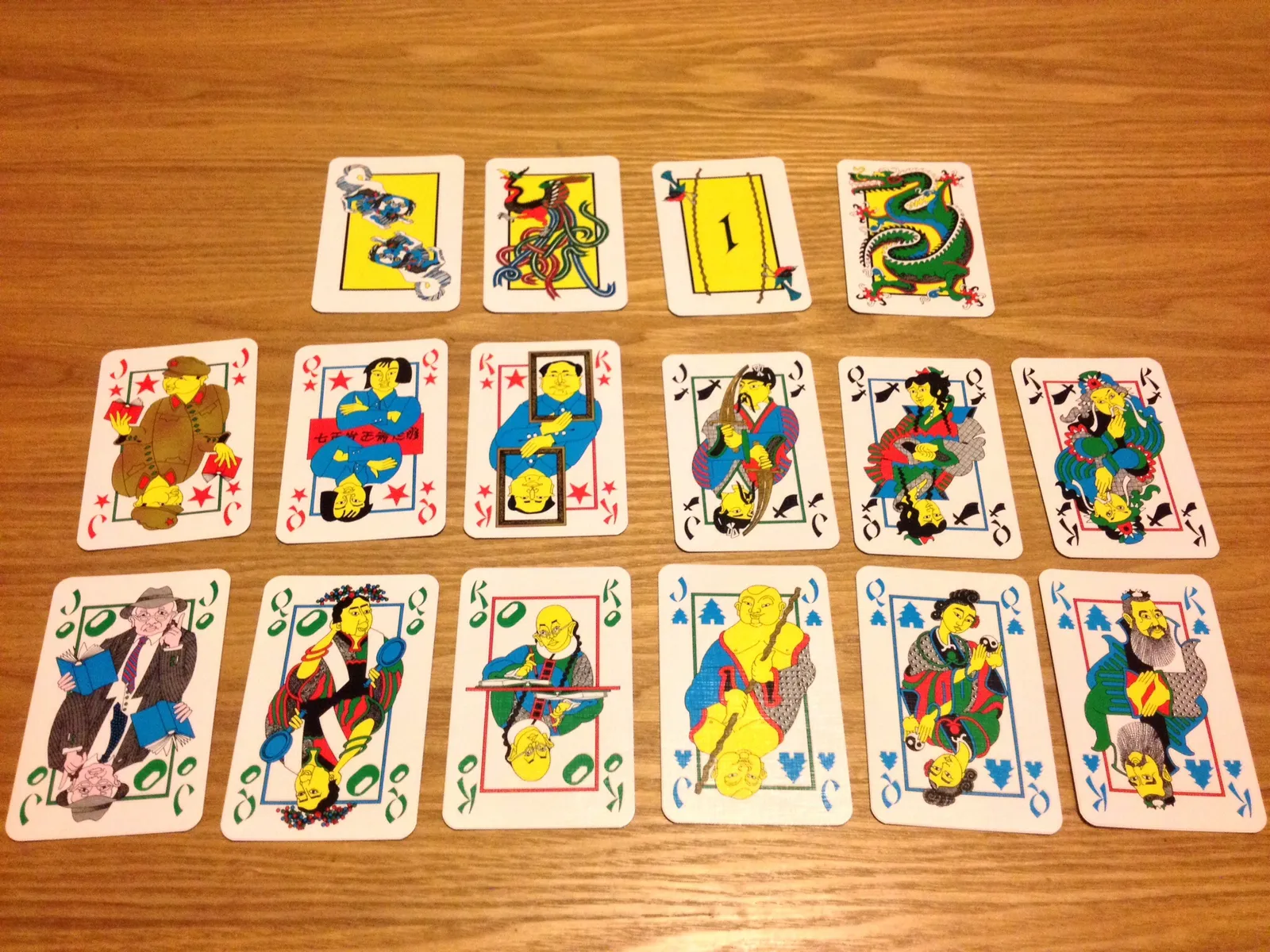 The game uses either one or two standard 52-card decks with four special cards added: dog, phoenix, dragon and Mah Jong (1). When it’s your turn, you may either beat the current top card combination — single card, pair of cards, sequence of pairs, full house, etc. — or pass. If play passes all the way back to the player who laid the top cards, they win the trick, clears the cards, and can lead the next one. The card led determines the only combination of cards that can be played on that trick, so if a single card is led, then only single cards are played; if a straight of seven cards is led, then only straights of seven cards can be played, etc.