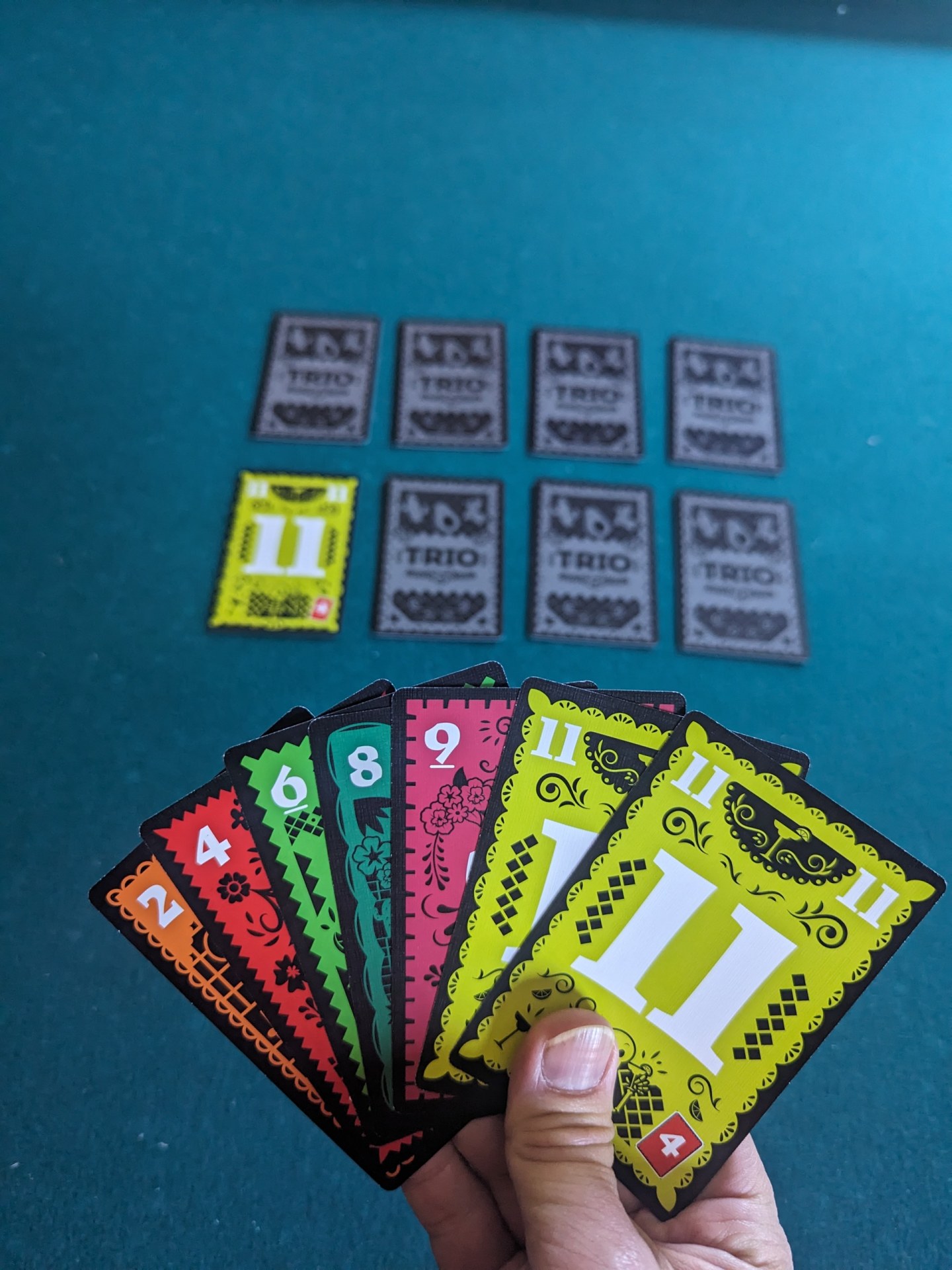 If you reveal three cards showing the same number, take these cards as a set in front of you. If you are the first player to collect three sets, you win — except that a player wins immediately if they collect the set of 7s or two sets that add or subtract to 7, e.g., 4s and 11s.