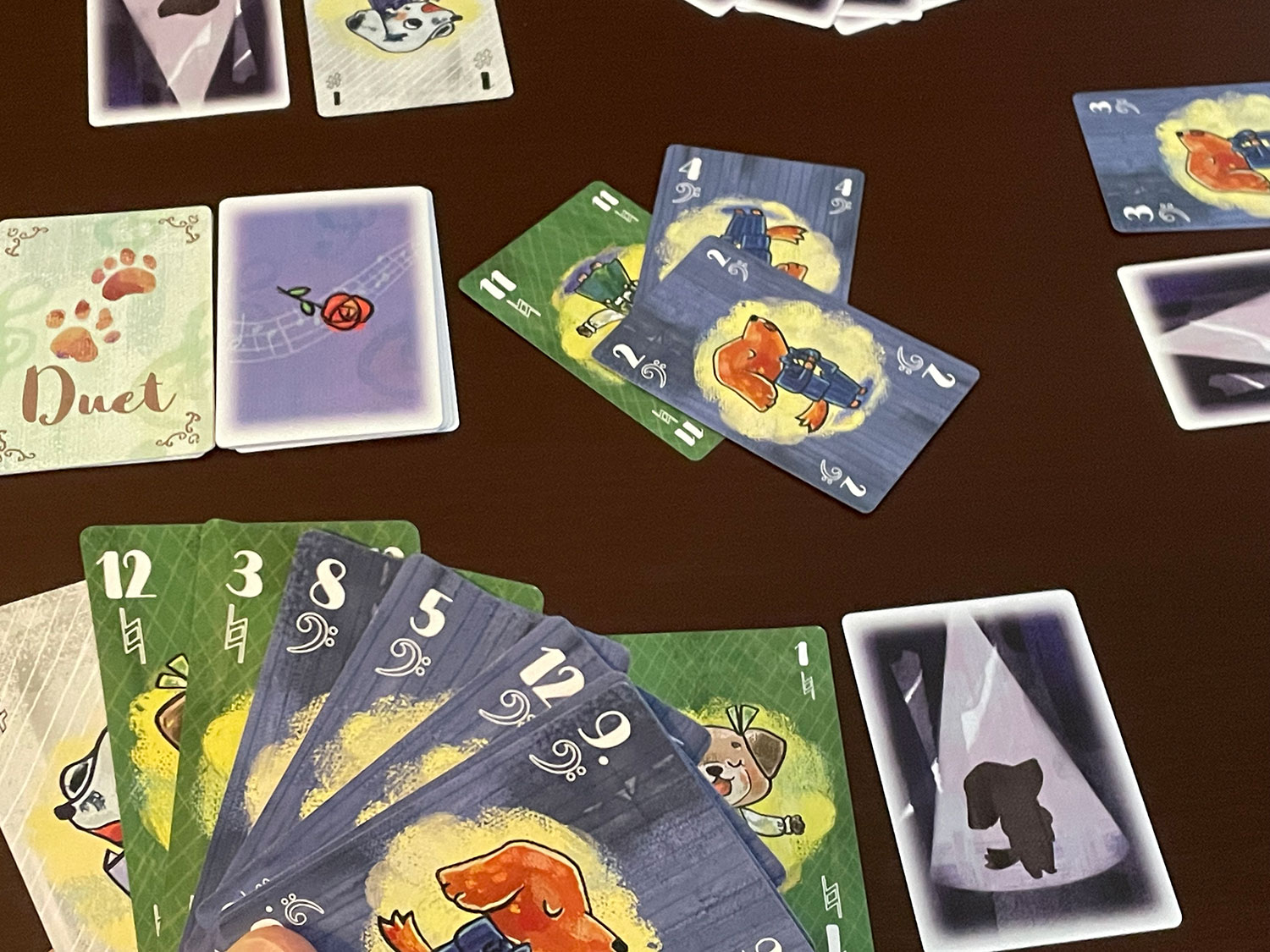 At the end of the trick, the player who played the highest on-harmony card scores two points, and the lowest on-harmony card scores for the value of that card (those bass notes are so important!).