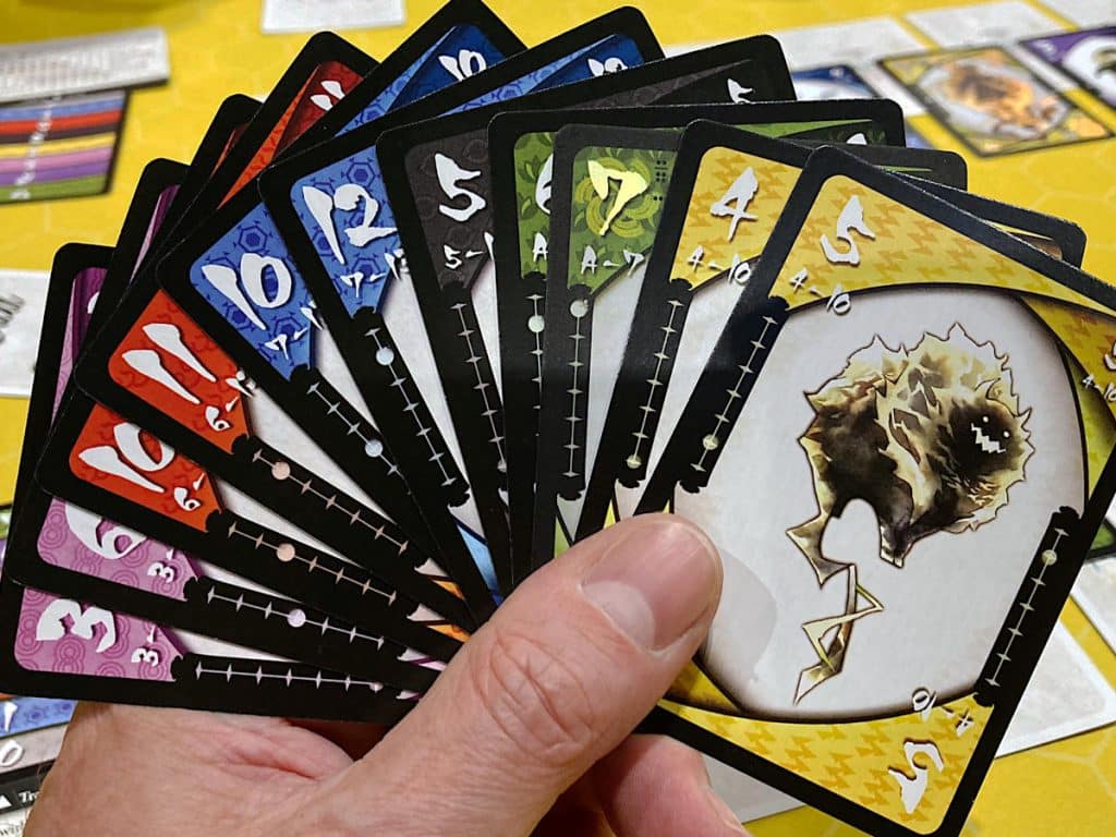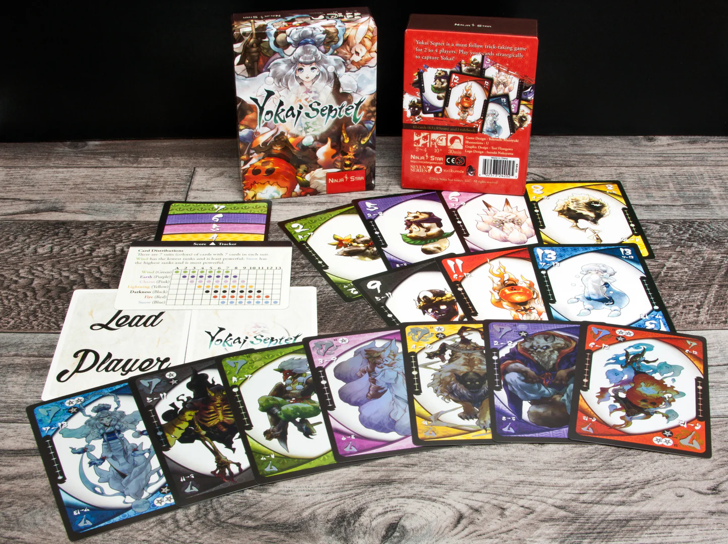 In Yokai Septet, your goal is to capture high scoring Boss Yokai by strategically playing cards from your hand. Each turn, players play a card from their hand following the rules of the “trick taking games.”